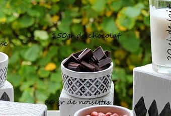La recette Les ingrédients :20 cl de lait12 cl de crème 80 gr de noisettes 150 gr de chocolat