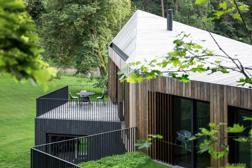 Le design épuré et angulaire crée un extérieur minimaliste, qui produit un contraste entre la matière première, le bois Kebony, et la base du bâtiment en ardoise noire. L’architecte, Arûnas Liola, a voulu concevoir une structure qui soit à la fois respectueuse de l’environnement et esthétiquement remarquable, et qui combine des matériaux naturels avec une forme sculpturale audacieuse.