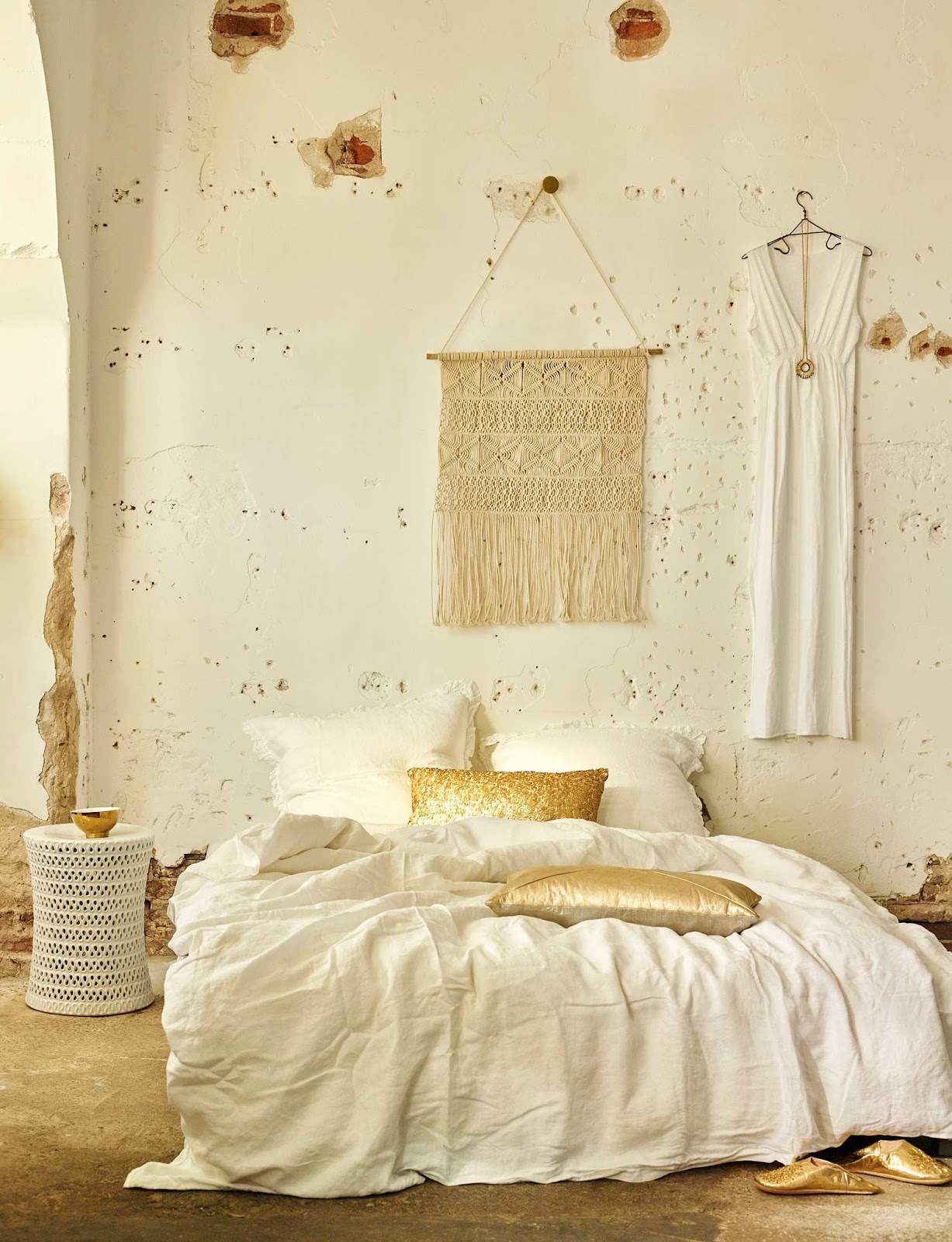 Coussin dorés similaires chez Zara Home - Housse de couette et coussin en lin à volants H&M home. Suspension murale en macramé dans le même esprit chez Fleux.
