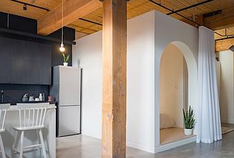 Broadview Loft offre un espace optimisé à souhait pour donner la part belle à la pièce à vivre. J'imagine que Brian est beau et riche, qu'il a le goût de la fête et plein d'amis merveilleux. Il fallait voir grand, intime aussi avec ces jeux de rideaux bien pensés.N'empêche que le petit, il s'est fait mettre en boite, au moins pour la nuit ! Évidemment qu'on l'adore cet intérieur malin dans la conception, rafraichissant dans l'ambiance et à la décoration juste parfaite pour un propriétaire au bon goût.